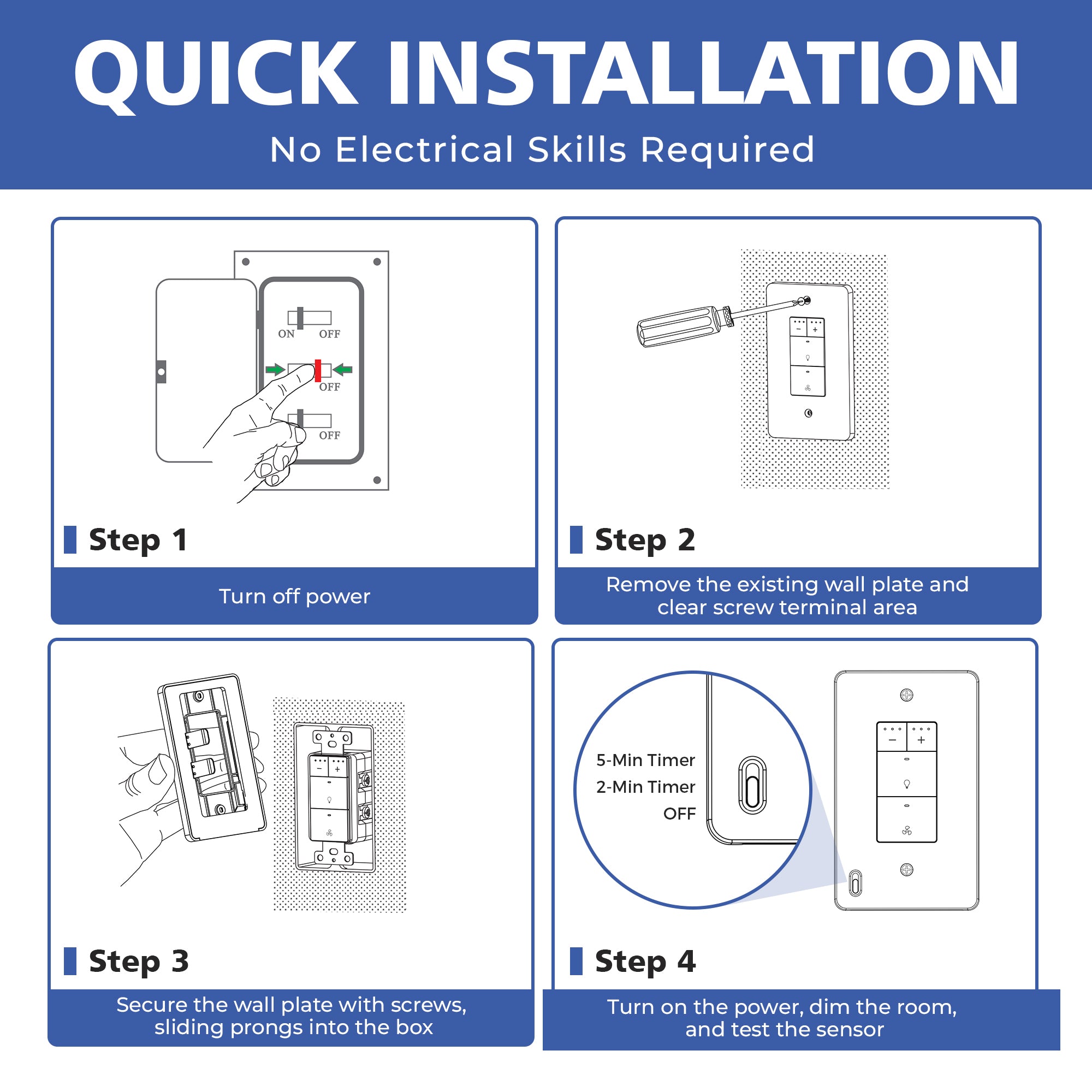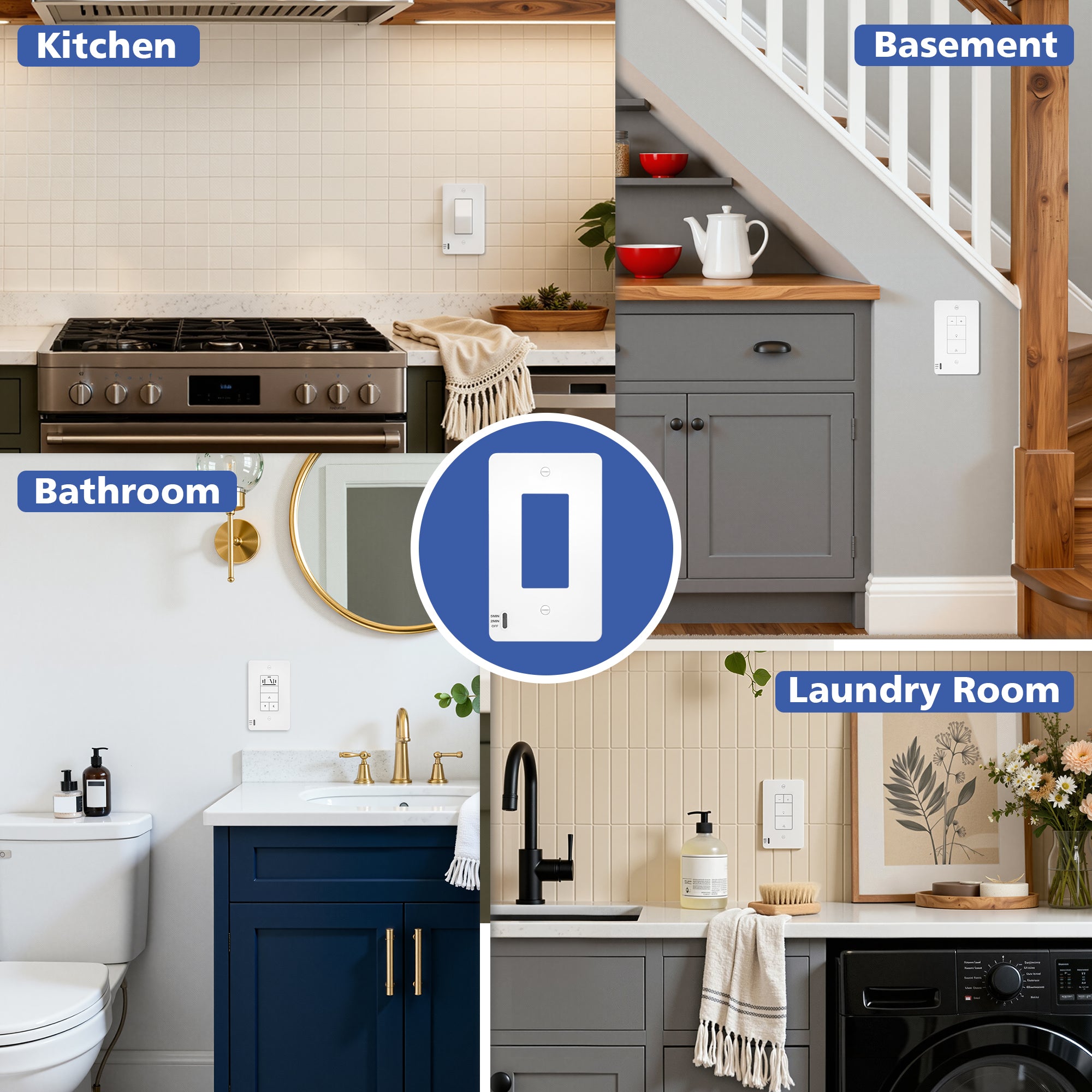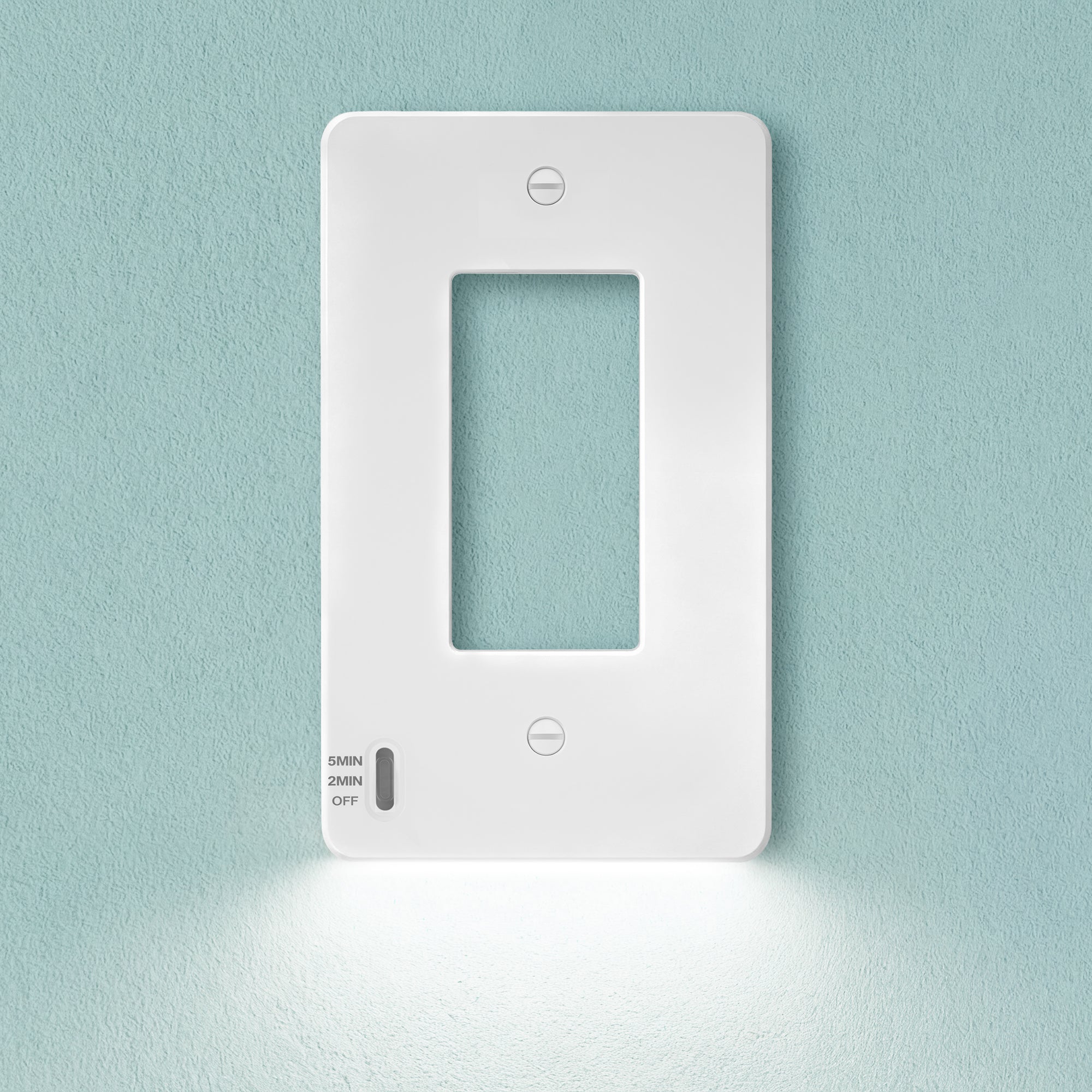 The AKICON Smart Sensor Timer Wall Plate is designed to complement and enhance AKICON sensor switches. It features a built‑in timer selector that allows you to quickly switch between 5‑minute, 2‑minute, or OFF countdown modes—ideal for bathrooms, closets, hallways, and utility areas where automatic shutoff is needed.