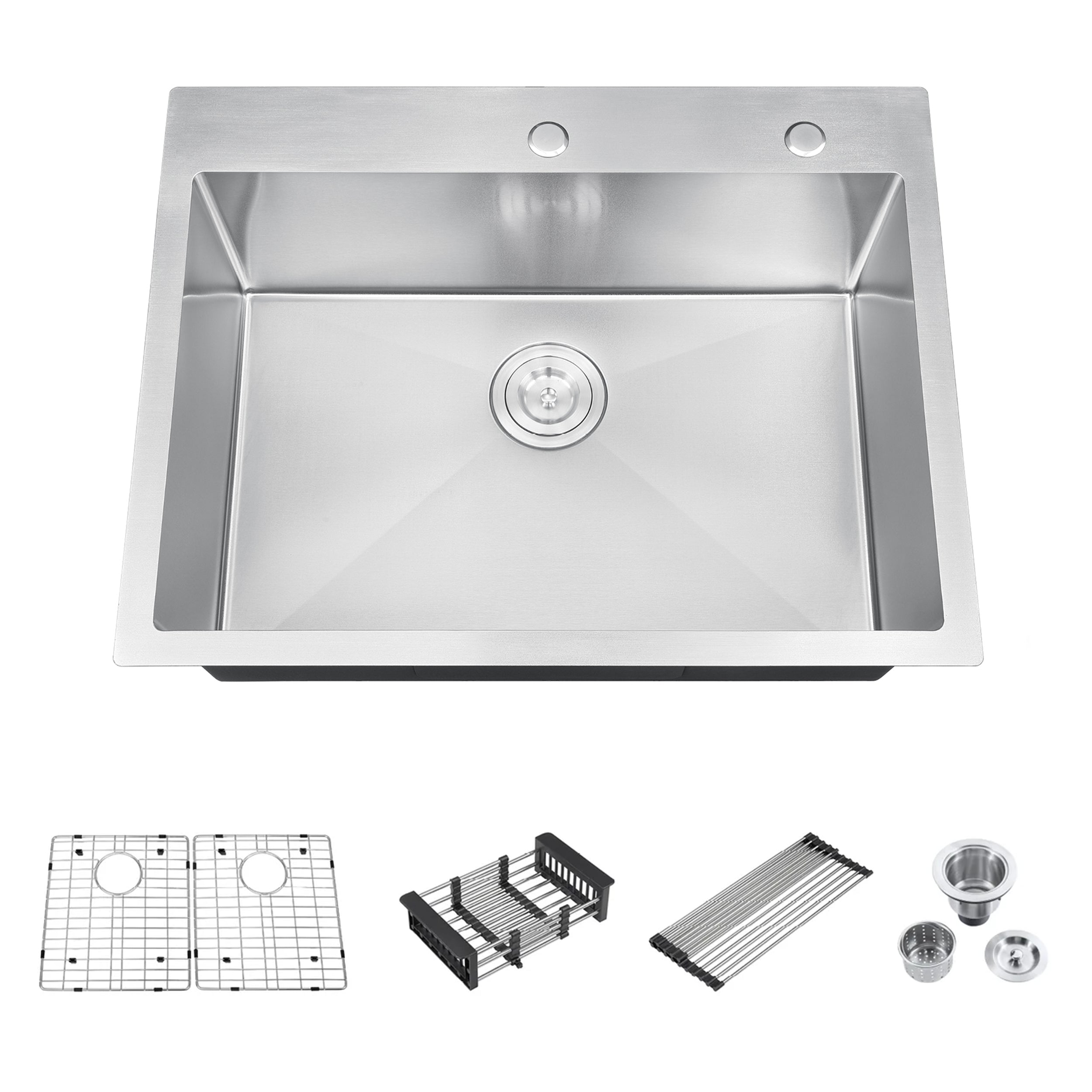 Drop in Topmount Stainless Steel Kitchen Sink Deep Single Bowl with Basket Strainer Drain & Bottom Grid