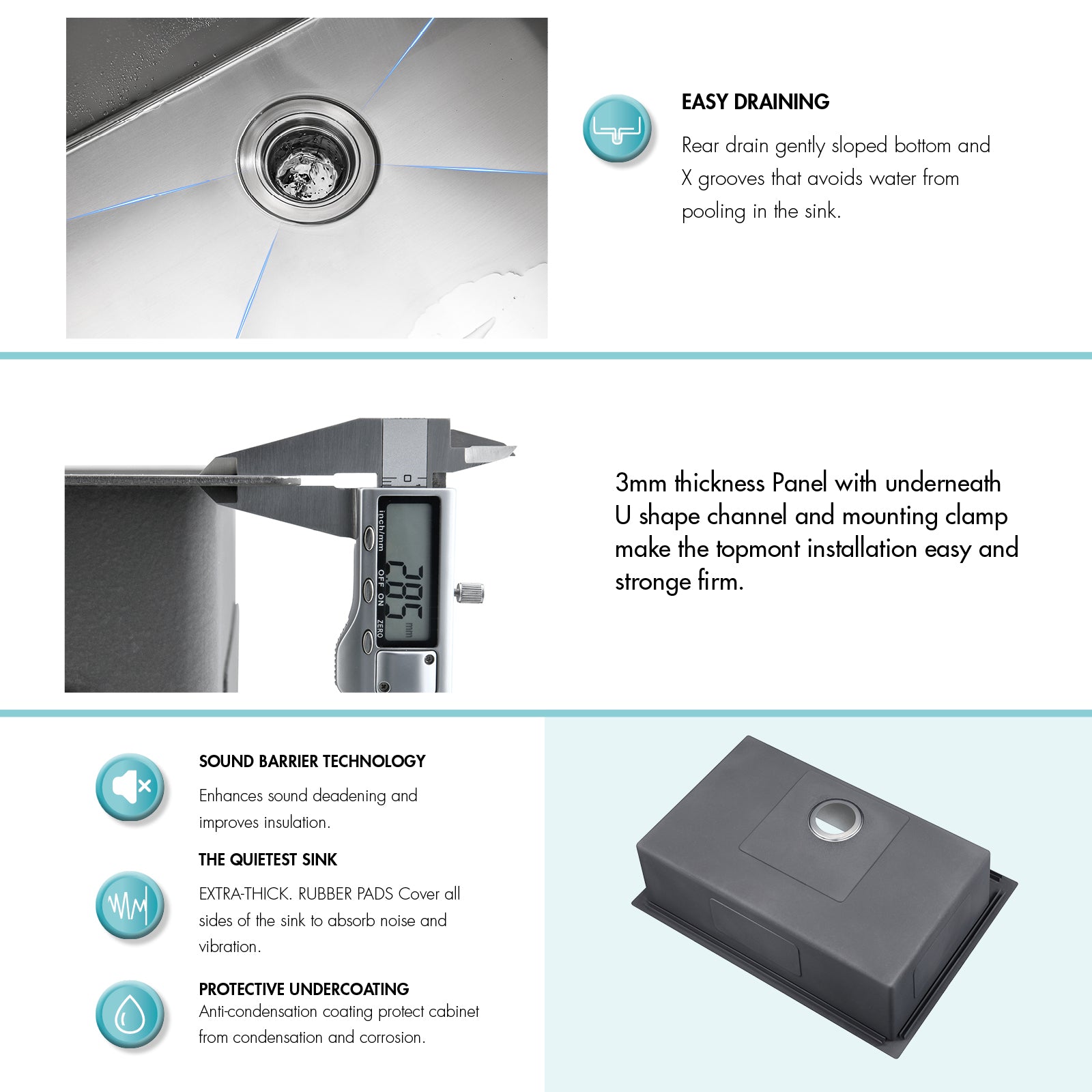 Yes. It features extra-thick rubber sound-dampening pads and an anti-condensation undercoating, reducing noise from running water and protecting your cabinets from moisture.